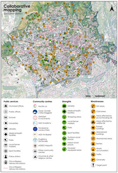 At the same time, inhabitants emphasized the strengths of the district with the aim of enhancing them through shared resilient urban regeneration actions (Figure 4 and Figure 6):