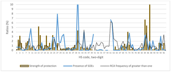 Comparison of products that are protected, SOEs produce and have RCA greater than one, HS 2002 (two-digit). Notes: To provide a clearer representation of other sectors, two outliers are excluded from the graph. The first outlier is the wood sector (HS code 40). The ratio of products produced by SOEs in this sector is 12.87. The second outlier is the vehicles sector (HS code 87). The RCA frequency of values greater than one in this sector is 21.89. It is notable that there are several codes that exhibit a value of zero. This happens when either no protection measures are imposed, no products are produced by SOEs or no RCA frequencies greater than one are observed for those specific codes. The products that have RCAs—revealed comparative advantage—are calculated through several steps. First, RCA data are collected at the HS 2002, the four-digit level from WITS database, covering the period from 2004 to 2017. The data are then sorted to identify products with RCAs greater than one for each year. Subsequently, the products are organized at the two-digit level. Finally, each section is divided by the total number of products with RCAs greater than one, which amounts to 3887. Processing details are reported in Tables S4 and S5.