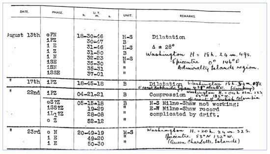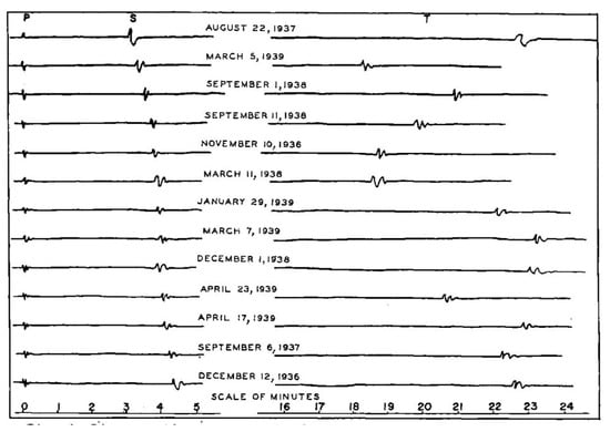 Prior to the inception of this CSIRO project, the UQSS observers had become aware of a strange new type of phase (T phase) with a characteristic signature and much later arrival. The observer learned from colleagues that these T waves travelled (earth > ocean SOFAR layer > earth) and were usually detected by observatories near the ocean. The first scientific reference to the T wave is attributed to Linehan [16] (Figure 1) who documented their arrival on Caribbean seismograms, shown in Figure 1.