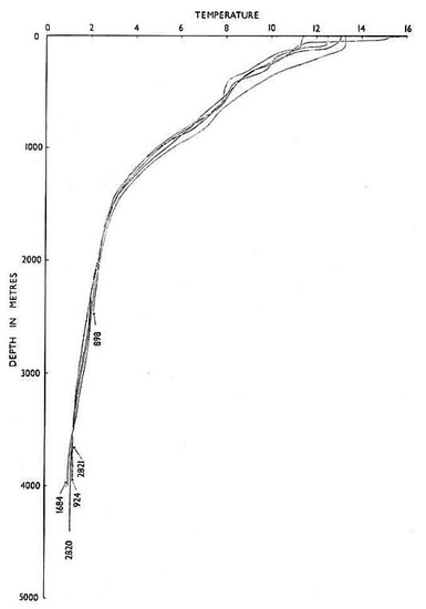 The variation of temperature with depth in the Tasman Sea showing the rapid decrease in temperature to a depth of 1500 m. The measurements were made by R.R. S. Explorer under the sponsorship of the Royal Society. Numbers refer to stations occupied. Permission applied for).