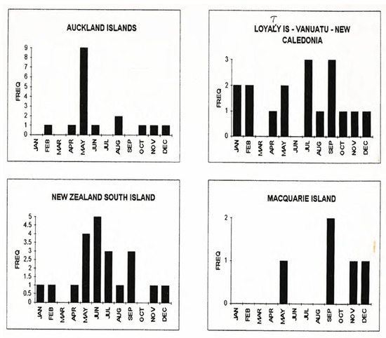 Figure 6. Ten year (1980–1990) T wave occurrence at BRS seismographs, analysed by month of occurrence and regions of origin, to show any seasonality (Original plots by 1995 students). - There may be a temperature or salinity effect from the migrating Antarctic Converge boundary that could affect the ocean temperatures around Macquarie Island, Auckland Island and Balleny Island sourced T waves (See Figure 7)