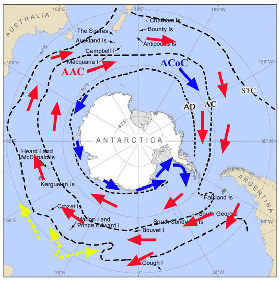 Figure 7. Major currents and fronts in the Southern Ocean and Subantarctic region: Antarctic Circumpolar Current (AAC), Antarctic Coastal Current (ACoC), Antarctic Divergence (AD), Antarctic Convergence (AC), Subtropical Convergence (STC) (4) (PDF) (Reproduced from Leach et al. (2016), with permission) [32].