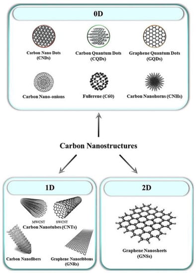 Different types of carbon nanostructures in zero, one, and two dimensions. Reprinted with permission from Ref. [84] with permission license 5537630623042. Copyright Elsevier. 29 April 2023.