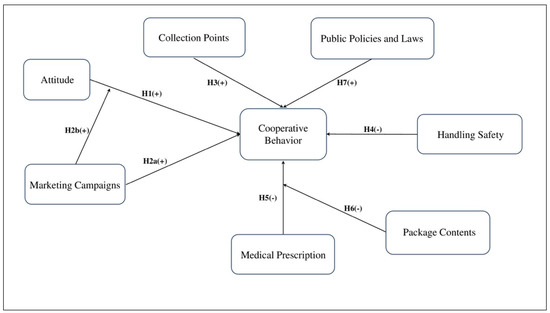 Marketing plays a crucial role in influencing user behavior by creating value and establishing favorable relationships [39]. It shapes user attitudes and engagement toward specific products, services, or processes [40]. Environmentally friendly marketing campaigns can inform users about necessary actions for environmental preservation and differentiate products in the market [41]. These campaigns have a positive effect on waste management by guiding users’ involvement toward proper household waste medicine (HWM) practices [42]. Thus, the second hypothesis focuses on the impact of marketing campaigns on user cooperative behavior in HWM management.