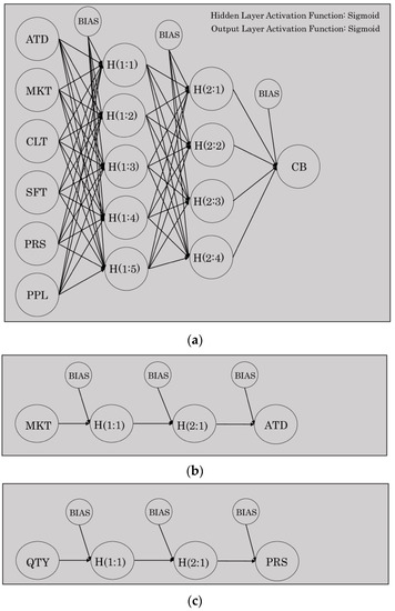 Moreover, regarding the ANN analysis, according to the theoretical model proposed in Figure 1, we developed three ANN models, as depicted in Figure 2. In Model 1 (Figure 2a), the dependent variable is CB, while in Models 2 and 3 (Figure 2b,c), the dependent variables are ATD and PRS, respectively. It is important to emphasize that Model 1 represents the direct relationships between variables in the SEM, whereas Models 2 and 3 represent the moderating effects of the SEM.