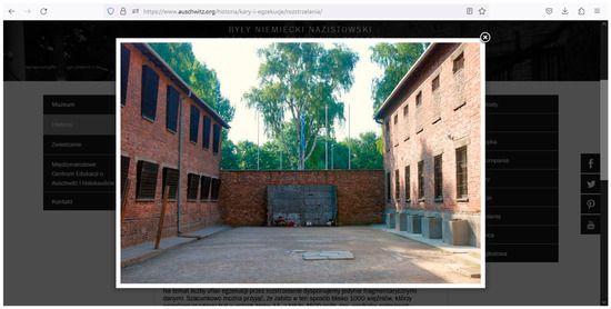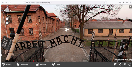Each museum in its virtual offer also has a virtual tour, sometimes called a 3D tour. In the case of the museum in Auschwitz-Birkenau, the visiting menu offers the opportunity to get to know the virtual: Auschwitz I, Auschwitz II, and Auschwitz-Birkenau—Alte Judenrampe (Figure 2). Each part enables a virtual walk; virtual arrows appear on the image indicating possible directions of sightseeing, redirecting to the next part of the camp. Each element is accompanied by a tab with textual information describing the element seen in the image, along with an active link to the bookstore where one can purchase the indicated publications extending the information. In addition to the virtual tour, there are 360 panoramas of the main parts of the camp, such as the camp kitchen, assembly square, and interior panoramas, as well as as the interiors of selected camp blocks. Virtual sightseeing also offers a map of the camp with active objects marked redirecting to images of these objects with a division in the map description into views from the outside and inside of the objects. The tour offers text information in Polish and English [129].
