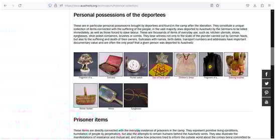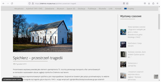The exhibitions of the museum in Bełżec are presented in a similar scheme: there is short information about the permanent exhibition combined with photos, and online exhibitions devoted to the Holocaust, prepared as a text accompanied by photos, available in pdf version. Online exhibitions of a similar scheme—a slide show consisting of text and accompanying photos—can be found on the website of the museum in Kulmhof (Figure 3) [130,132].