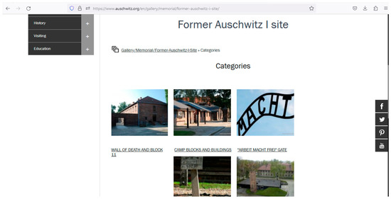 Other camps present similar or intermediate situations. In Sobibór and Bełżec [133,134], information about the history of the camp appears in the general History tab, next to the subpages Calendar and Map of the Lublin Region, where it is located. The text on history is relatively long, but not accompanied by pictures. The information offered by the museum at Majdanek is much more extensive. In the History tab, there is a subpage, the history of the camp, next to the following subpages: calendar, prisoners, map of Lublin, map of the Lublin region, and blog. The very history of the camp leads to further detailed information collected in the following categories: general information; camp buildings; camp admission process; the origin of the prisoners; crew; living conditions; timetable; work; penalties; prisoner clothing and markings; functional prisoners; infirmary—camp hospital; extermination; resistance movement; liquidation of the camp; Wehrmacht labor camp; NKVD camp; processes. Each of the subpages, after expanding, contains text and a short film developing or supplementing the topic [131].