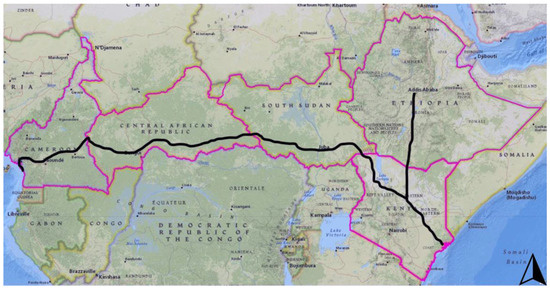 Among the 34 proposed TTCs across Africa, this study centers on the Great Equatorial Landbridge (GELB), a proposed TTC spanning 6497 Kilometers. Though GELB is proposed as a multi-modal facility hosting a highway, high-voltage power lines, railway, and gas pipelines, this research is limited to its highway component. Specifically, GELB highway is planned to provide a link from the Atlantic Ocean in West Africa to the Indian Ocean in the East while traversing five nations. The five GELB project nations shown in Figure 1 include Cameroon, Central African Republic, South-Sudan, Ethiopia, and Kenya. In 2015, the eastern portion of the GHP across Kenya, Ethiopia, and Sudan was identified among 11 projects whose delivery is to be politically championed because of their high development potential [41,42].