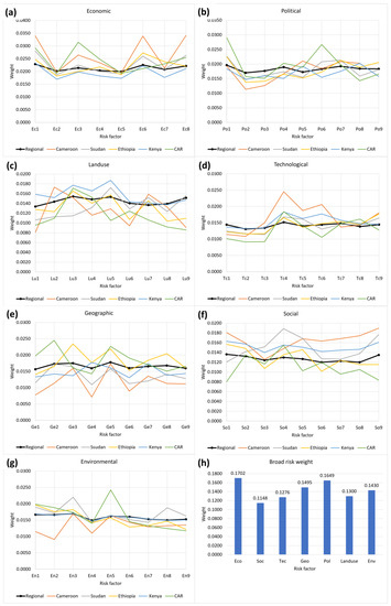Risk weight comparison by country. (a) economic risks, (b) political risks, (c) land use risks, (d) technological risks, (e) geographic risks, (f) social risks, (g) environmental risks, (h) broad risk weights.