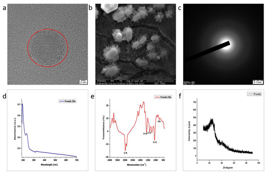 Characterization of CDs derived from coconut fronds. (a) HR-TEM (Red circle shows the lattice structure of carbon dot). (b) SEM. (c) SAED pattern. (d) UV-Vis spectrum. (e) FTIR peaks. (f) XRD pattern.