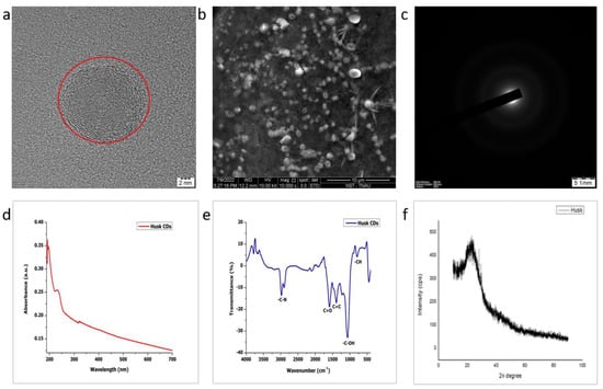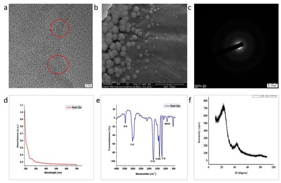 Characterization of CDs derived from coconut shells. (a) HR-TEM (Red circle shows the lattice structure of carbon dot). (b) SEM. (c) SAED pattern. (d) UV-Vis spectrum. (e) FTIR peaks. (f) XRD pattern.