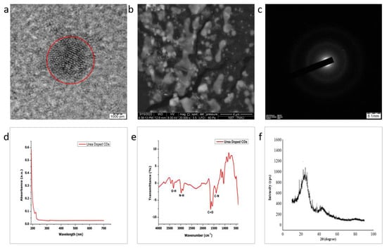 Characterization of urea-doped CDs (1:1). (a) HR-TEM (Red circle shows the lattice structure of carbon dot). (b) SEM. (c) SAED pattern. (d) UV–Vis spectrum. (e) FTIR peaks. (f) XRD pattern.