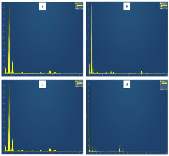 EDAX graph showing the elemental compositions of CDs derived from (a) fronds, (b) husks, (c) shells and (d) urea-doped CDs (1:1).