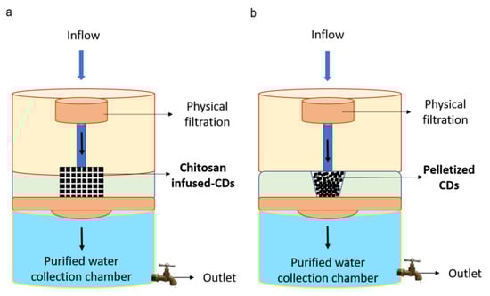 Lab-scale prototypesdesigned for assessing the water disinfection potential of CDs: (a) chitosan-infused CDs; (b) pelletized CDs.