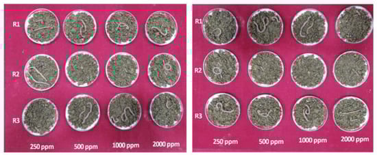 Biosafety test of pristine CDs (left) and urea-doped CDs (1:1) (right) on Eisenia fetida.