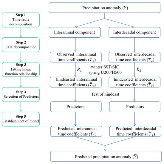 Before and after applying the TSD method to the precipitation anomaly fields, EOF decomposition, selection of predictors, and establishment of prediction models will be conducted. The complete prediction process using the TSD method is shown in Figure 2.