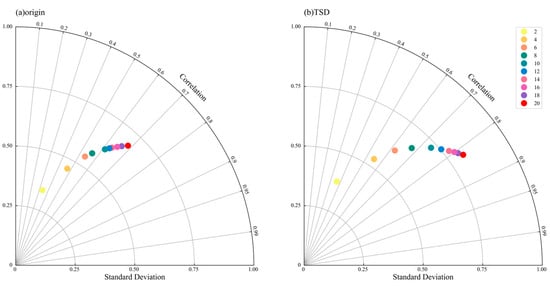 Taylor diagrams of the observed precipitation anomaly fields and the reconstructed precipitation anomaly fields (a) without and (b) with TSD during 1961–2010 (dots represent the different numbers of EOF modes used for reconstruction).