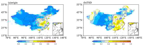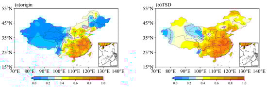Based on the spatial patterns and time coefficients of the first eight modes, the precipitation anomaly fields are reconstructed, and temporal correlation coefficients (TCC) are calculated to compare the influence of the TSD method on the reappearance ability of the precipitation anomaly (Figure 4). From Figure 4a,b, the spatial distribution of TCC have great differences between the reconstructed precipitation anomaly fields with and without TSD. For the reconstructed fields of original precipitation anomaly, TCC are small in Northwest China, Northeast China, and a part of Southwest China, which fail the significance test at 95% level (Figure 4a). In contrast, TCC of the reconstructed precipitation anomaly fields with TSD have been significantly improved in these regions, although some stations in Northwest China still perform poorly (Figure 4b). Therefore, when using the first eight EOF modes for reconstruction, although the summer precipitation anomaly in East China, especially in the Yangtze–Huaihe River Valley, can be reproduced with or without TSD to a certain degree, the reconstructed fields after TSD can represent the characteristic of variation of precipitation in western and Northeast China.