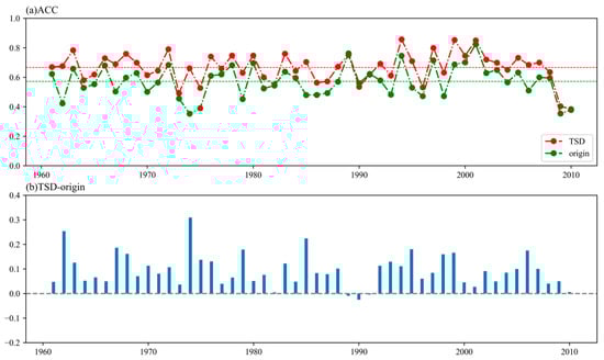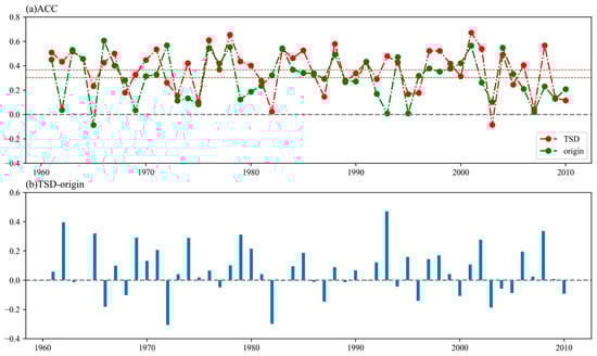We also calculated the ACC of predicted fields before and after TSD (Figure 9). During the hindcast period, the ACC of the predicted fields without TSD ranged from −0.087 to 0.61, with an average of 0.30, while the ACC of the predicted fields after TSD ranged from −0.086 to 0.67, with an average of 0.37. It can be seen from the difference between them in 50 years, the ACC of the predicted fields with TSD is higher than that without TSD for 30 years. Conversely, the ACC of the predicted fields before TSD is higher than after for only 13 years (the differences are so small in other years). Through the test of ACC, it can also be concluded that the prediction model performed better after TSD for summer precipitation anomaly in China.