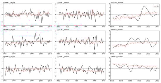 Observed (black solid line) and predicted (red dotted line) time coefficients of the first three EOF modes (the left column represents non-TSD, the middle column represents the interannual component of TSD, and the right column represents the interdecadal component of TSD).