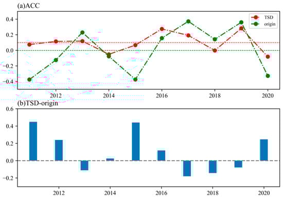 In addition, we also tested the predicted precipitation anomaly fields from 2011 to 2020 using the prediction model for an independent sample test (Figure 10). It is seen that although the ACC of the forecast model without TSD is higher than that with TSD in several years, its prediction skill in 10 years is unstable, ranging from −0.38 to 0.37, and the average is only −0.002 (i.e., negative skill). Especially in 2011, 2015, and 2020, ACC was very low. In contrast, the ACC of the forecast model after TSD is positive in almost all years except three years close to 0. The overall performance is stable, and the average is 0.10, more than 0.1 higher than the forecast model without TSD. Therefore, it is not difficult to find that the TSD method can effectively improve the prediction skill of the original forecast model without TSD in an independent sample test.