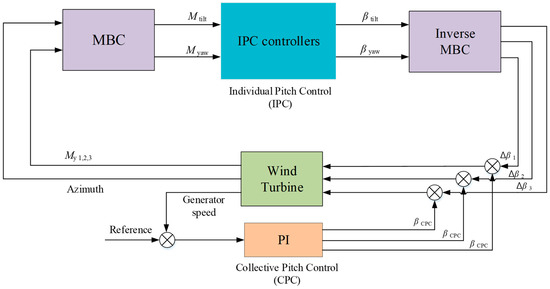The turbine controller can be operated by pitch and torque control strategies. In the above-rated wind condition, pitch control is mainly used with torque kept at the rated value. To keep the output power at rated values, the pitch angles of the three blades are controlled simultaneously in the case of CPC and distinctly for IPC. Figure 2 represents the overall IPC control scheme.