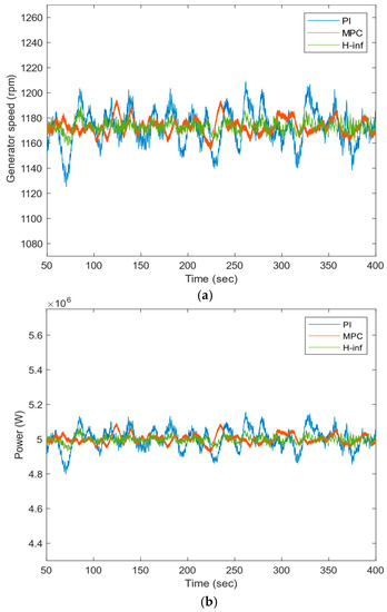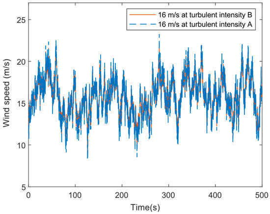 In this section, the performance of MPC and based IPC are investigated at 16 m/s mean wind speed with a turbulence intensity B. The ny and nh, for MPC are taken as 20 and 10, respectively, with a weight of 3 10−10. Their values are chosen accordingly to get the proper variation among the three individual pitch angles (approx. 120 phase difference) to minimize the blade root bending moment [10]. Also, parameters are selected so that the gain cross-over frequency (bandwidth) of the controller is maintained between 0.6 to 2 rad/s for optimum control performance and stability of the wind turbine system [40]. The sampling time is set to 0.0125 s. The sampling time is taken in this study as 0.0125 s to avoid a mismatch between the simulation time of FAST and MPC s-functions [35,41]. Figure 6 shows the generated turbulent wind speeds at 16 m/s with two corresponding intensities.