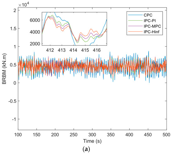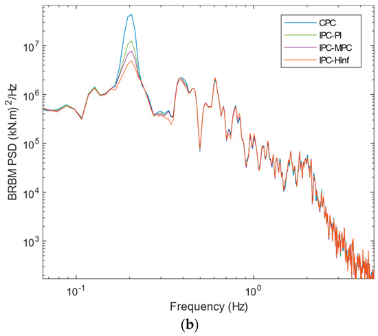 In this section, the simulation is carried out at a mean wind speed of 16 m/s at turbulent intensity A (18%). The BRBM and its PSD are portrayed in Figure 9a,b, respectively. Figure 9b shows that the peak 1P in the case of IPC- is attenuated by 55.71% compared with IPC-PI, and compared with IPC-MPC, a reduction of 30.64% is observed. Thus, a noticeable improvement in the performance of IPC- is observed compared to the other reported controllers in alleviating loads at 1P frequency in both time and frequency domains.