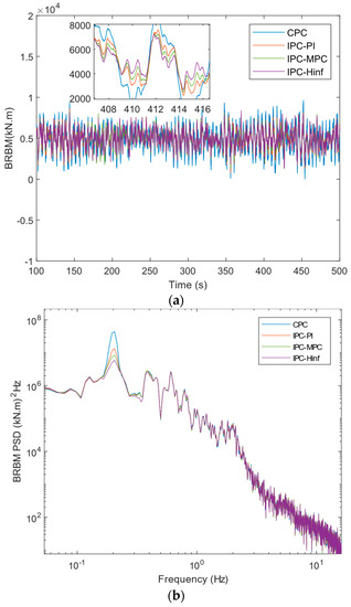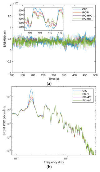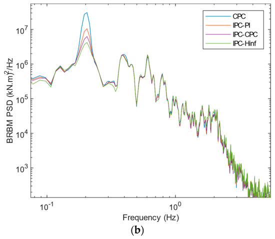 Figure 7a shows a comparison of the blade root bending moments (BRBMs) produced by the CPC-PI, IPC-PI, IPC-MPC, and IPC- controllers. The corresponding power spectral densities (PSD) are shown in Figure 7b.