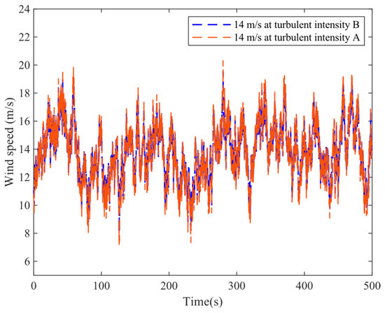 In this section, IPC-based controllers are verified in time and frequency domains at 14 m/s mean wind speed with turbulence intensity B. ny and nh are set to 20 and 10, respectively, and weight is taken as 2 × 10−10. The sampling time is considered as 0.0125 s. The turbulent wind speed field at two intensities (NTM B and A) at 14 m/s is shown in Figure 12.