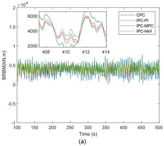 The quantitative comparisons of the performances of the reported controllers are evaluated. Table 3 shows a quantitative comparison of the performance analysis of CPC, IPC-PI, IPC-MPC, and IPC- controllers in terms of BRBM at two mean wind speeds (14 m/s and 16 m/s) with a turbulent intensity A [37,38]. The results in the table demonstrate that the standard deviation of the BRBM for IPC- is reduced by approximately 25.46%, 29.37%, and 30.08%, respectively, compared to CPC, IPC-PI, and IPC-MPC for a mean wind speed of 14 m/s. A reduction of 27.19%, 31.05%, and 32.9%, respectively, is observed for 16 m/s wind speed.