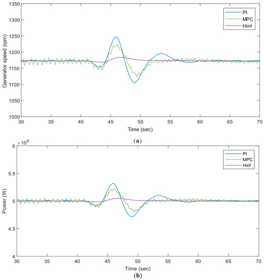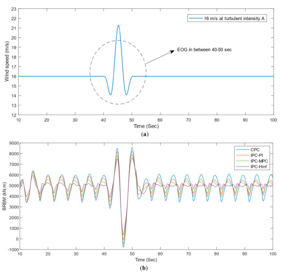 To investigate the controller’s performance at extreme wind operating points, the extreme operating gust (EOG) conditions in IEC 61400-1 3rd Ed. for turbulence, category A [37] is used. Figure 16a illustrates the time series of the wind speed at 16 m/s with EOG conditions (between 40–50 s).