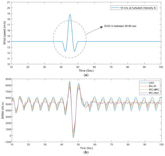 An EOG simulation is also conducted at 14 m/s with a turbulent intensity A to further investigate the controller’s performance. The obtained results are shown in Figure 17a,b, respectively. Similar results are obtained regarding the reduction of BRBM to those obtained at 16 m/s above, signifying superior performance of the controller compared to the other reported controllers.