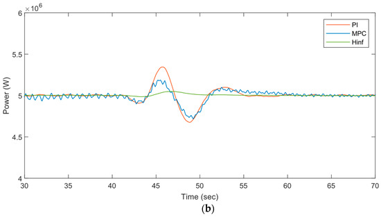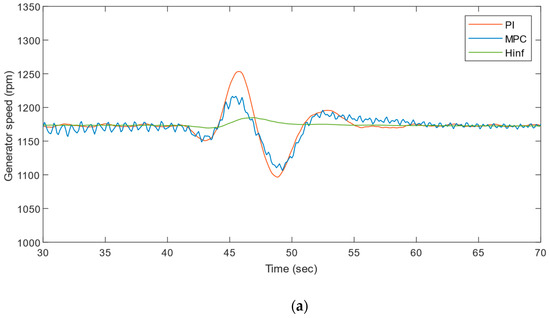 To further validate the effectiveness of controllers, simulations are performed at two different wind speeds in the EOG conditions. Figure 18a,b portray the generator speed and power plots obtained from the wind turbine at 14 m/s wind speed in the EOG. Similarly, Figure 19a,b show generator speed and power plots at 16 m/s wind speed in the EOG. The simulation results show that the controller performed better in terms of recovery time and reduced power fluctuation compared to the other reported controllers in the EOG region (40–50 s).