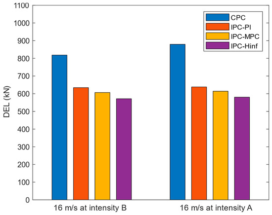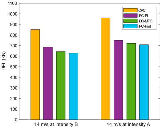 As detailed in Figure 20 and Figure 21, the IPC controllers produce lower DEL values at varying turbulent wind speeds. At turbulent intensity B, the average reduction in DEL under IPC schemes is calculated as 23.41% compared to CPC for 14 m/s wind speed, whereas the value produced for 16 m/s mean wind speed is 26.16%. At turbulent intensity A, the average percentage reduction in DEL for 14 m/s is calculated as 24.47%; similarly, the value for 16 m/s is 30.51%. This indicates the improved performance of IPCs over CPC. Moreover, IPC- achieves improved DEL reduction compared to the other controllers reported in this study.