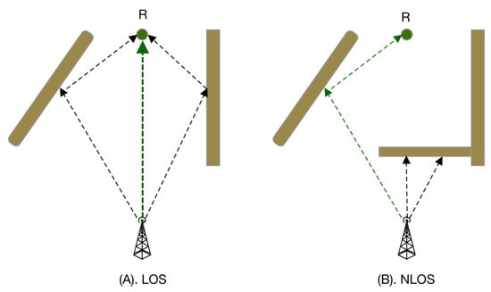 Signal propagation path with LOS vs. NLOS (A) Signal propagation path with LOS. (B) Signal propagation path with NLOS.