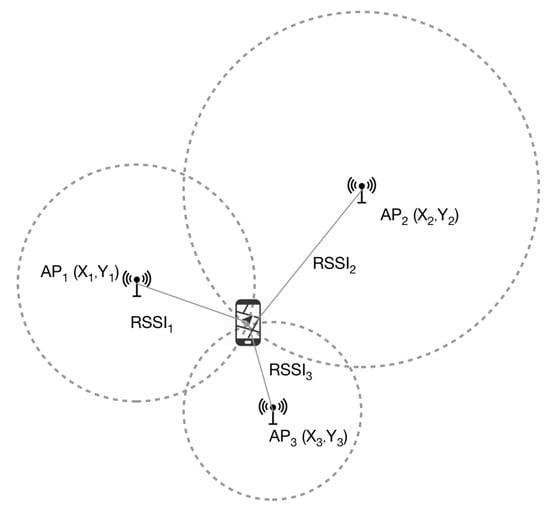The Wi-Fi (IEEE 802.11) radio-propagation-based sustainable indoor positioning system is vital due to the low-cost hardware, use of existing infrastructure, and adaptability at scale among smartphone users due to its wide availability and ease of implementation. The positioning method, which uses the received signal strength indicator (RSSI) measuring technique [4,5] usually depends on the environmental factors, the placement of the access points, the surrounding structure, and signal interference. Since there is often a trade-off between accuracy, robustness, and practicability in the design of location-based services, RSSI-measurement-based IPS [11,12] is one of the most commonly used methods. RSSI is widely preferred due to its cost-effective approach and acceptable accuracy. The issues encountered by IPS in the practical environment are weak signals, NLOS, wireless channel variations, multi-path fading, the absence of adequate RSSI values of access points already being deployed in an indoor environment, barriers such as walls, floors, humans, or even temporary blocks like furniture in indoor environments, an inaccurate floor map that requires frequent updates, changes in access point position, changes in indoor environment that lead to an invalid fingerprint dataset. The Wi-Fi RSSI-based localization algorithm mainly depends on radio propagation behavior. The RSSI is used by the range-based algorithms to compute the distance between nodes since RSSI measurements are simple to use and consume less power compared to other methods. Trilateration, triangulation, and fingerprinting [13,14,15] are the most widely used RSSI-based localization techniques.