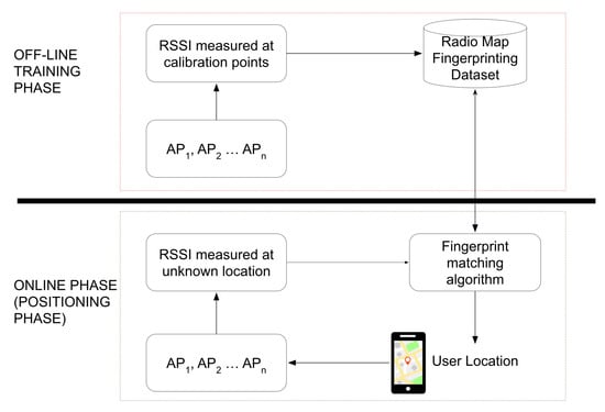 Use of the Wi-Fi fingerprinting approach [5] to identify the user’s location has attracted much attention, since this method needs no line-of-sight from the access point’s signal. This method considers any irreversible distortion in the signal, blocks the signal during the offline/training phase and, therefore, does not rely on the LOS. The fingerprint-based positioning has a training/offline phase and an online phase, as shown in Figure 3. During the training phase, the indoor environment location’s radio map fingerprinting is recorded and saved in the centralized data storage.