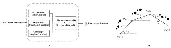 (A) Estimation of position using the PDR method. (B) PDR Tracking using IMU sensors.