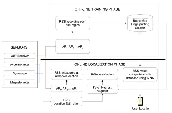 During the offline phase, the recorded fingerprinting dataset takes account of LOS or other permanent barriers to the access point’s radio signal. A user’s indoor position can be estimated in the online phase by matching the RSSI values using the KNN matching algorithm. The offline phase takes a lot more time to collect all RSSI values in every position. If there are any adjustments in the Wi-Fi access point system or location, then all offline calibrations need to be repeated [35,38] and the process becomes cumbersome.