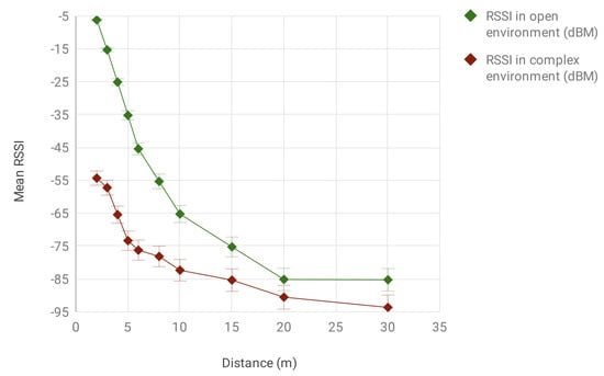 The first experiment was conducted on the testbed environment to understand the RSSI behavior in an open and complex environment. The open space environment provides an LOS between the signal transmission and the receiver, without any barrier in the signal’s path. In contrast, the complex environment has NLOS due to barriers in the path and human interventions. It does not provide LOS for the signal, which is closer to the realistic indoor environment’s reflection. We measured the RSSI propagation signal at a constant distance in open space and complex environments and plotted the graph to see the signal error in the complex environment. We can observe that the error difference in RSSI signal propagation ranges from 10 to 50 dBM, and the distance error is within the range of 4–12 m, as shown in Figure 6.