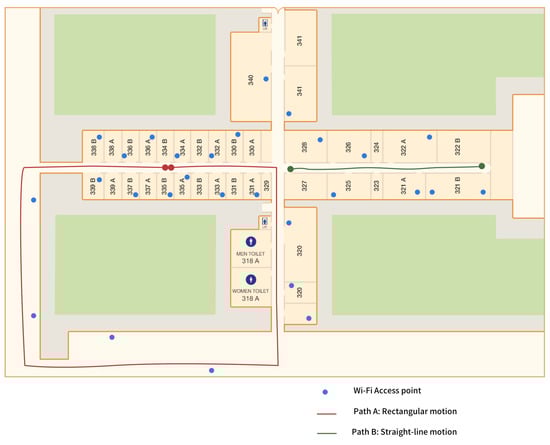 In the testbed environment, the system’s effectiveness was assessed along the pathways (Path A, Path B), Table 2 provides path details about the number of direction changes from the start to end of the path, the total distance covered by each path, and the number of unique scanned access point RSSIs along the path. In the testbed, along with Path A and Path B, as shown in Figure 7, we set up multiple barriers and human interventions along the signal propagation path. The mean distance error is determined by averaging the DE for all positions in the travel direction. From Figure 9, the proposed method is shown to have fewer location errors and better accuracy when compared with the standard fingerprinting algorithm. The mean distance error rises proportionately with the increase in the number of barriers/blocks to the radio signal, as depicted in Table 3. By tracking the direction and monitoring over time, we can determine whether the change in the environment is transient (like a person walking by the access point) or by a permanent factor (such as a new construction, or a change in the location of the access point). This will show when to return to the offline recording phase over time.
