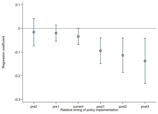 It has been argued that time-varying DID may have some bias if it relies on a single estimator alone. Huang et al. argue that dynamic effects can improve the test results’ robustness; the authors of this paper have therefore drawn on their study to construct the following model (7) for dynamic effects testing [
