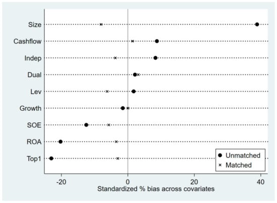 82]. A single effect of the test variable on the outcome variable is achieved by matching samples in the control group with characteristics similar to the treatment group and controlling for the effects of other factors on the outcome variable. The specific steps include: (1) selecting matching variables to construct a logit model to calculate the propensity score, which is recorded as the PS value (implemented through Stata); (2) selecting matching methods to match the samples; (3) testing the premise hypotheses, i.e., the balanced hypothesis and the common support hypothesis. The conditions that need to be met to test the balanced hypothesis are that the standardized deviation of each matched variable in the control and treatment group samples after matching fluctuates around 0%, i.e., there is no significant difference between the means of the variables in the two groups of samples. Pre-matching and post-matching samples are generally used in empirical tests.