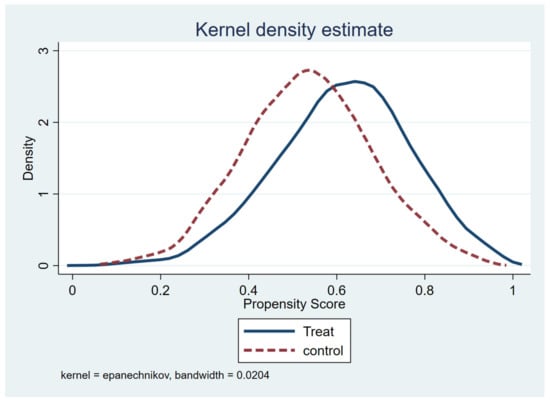 Figure 2, the matching variables of the treatment and control groups were significantly different before the matching of the samples, and the resulting individual differences may have affected the test results; however, after the propensity score matching, the standard errors of the matching variables fluctuated slightly around 0%, indicating that the sample characteristics before and after the matching were basically the same, i.e., the “balanced hypothesis” test was passed. According to the results of the common support hypothesis test in