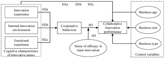 An individual’s ability is crucial to the outcome of their entrepreneurial activities [9]. Therefore, this paper follows the discussion of the previous studies on the cognitive characteristics of individuals and teams and chooses the innovation experience of innovation teams in their previous collaborative innovation activities (hereafter referred to as innovation experience), the internal innovation environment of the enterprises that they work in (hereafter referred to as internal innovation environment), and the emotional experience during innovation activities (hereafter referred to as emotional experience) as the proxy variables for the cognitive characteristics of innovation teams.