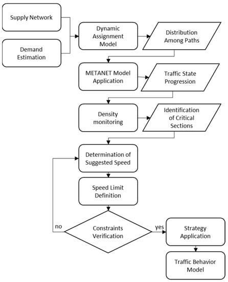 Figure 1 shows the logical architecture of the methodology. First, the demand is loaded onto the supply by means of the dynamic assignment model providing the distribution among the different paths. Next, METANET model application provides the traffic state progression. Then, the density is monitored in order to identify the critical sections. After, the strategy determines the suggested value of speed. Finally, the speed limit is calculated according to the distance between the critical section and the VMS. It is necessary to verify some constraints, as described in detail in Section 3.2, once the strategy has been applied; the traffic behavior model defines the VSL effect to user behavior.