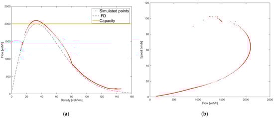 As can be seen from Figure 2a, the simulated points follow the trend of the function with respect to the steady states of the fundamental diagram of segment 5. This can also be seen in the speed-flow diagram of the same segment shown Figure 2b, where a well-defined trend emerges for the lowest speed values.