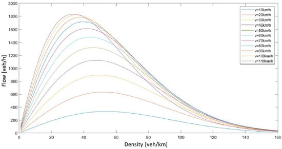 with v′f = vf × b, k′cr = kcr × [1 + A × (1 − b)] and α′ = α × [E − (E − 1) × b], where the parameter A determines the magnitude of the deviation of the critical density, usually ranging from 0.6 to 0.7 and in this study set equal to 0.67, as in [], while the parameter E determines the disposal capacity and it is set equal to 1.5. Figure 3 shows that as the travel limit speed decreases, the critical density progressively increases from 33.5 veh/km (obtained with the speed vf = 110 km/h) to a maximum value of 57 veh/km with vf = 10 km/h. This effect is due probably to the more cautious users’ behavior in the case of a lower speed limit.